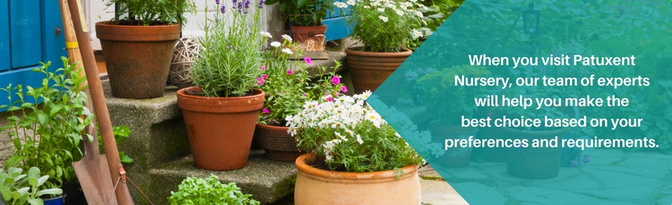 Even when you know what you’re looking for, it’s not always easy to decide which pottery selection is right for you. When you visit Patuxent Nursery, our team of experts will help you make the best choice based on your preferences and requirements.