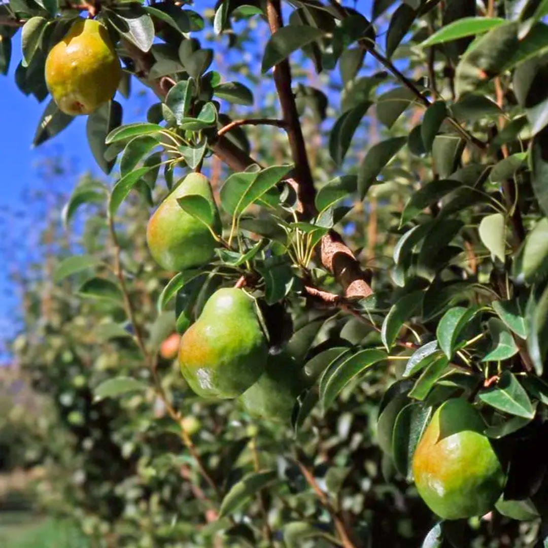 Fruit ripens in late summer, earlier than many other pear varieties, and is medium to large with smooth green skin that turns golden yellow as it matures. The flesh is creamy white, juicy, and tender with a rich sweetness and pronounced pear aroma. Bartlett pears are excellent for fresh eating, canning, baking, sauces, and preserves, and are especially well known for producing high-quality canned pears due to their flavor and texture. The fruit also ripens well off the tree, allowing for flexible harvest timing.