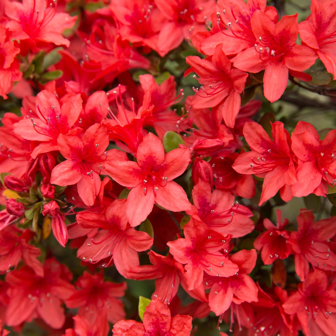 In mid-spring, Buccaneer Azalea becomes covered in clusters of funnel-shaped flowers in vivid coral-red to reddish-orange tones. The blossoms appear in abundance, creating a dramatic burst of color that contrasts beautifully with the plant’s glossy green foliage. When planted in groups or mass plantings, the flowers form an especially eye-catching display that can brighten shaded garden areas and draw attention to landscape beds.