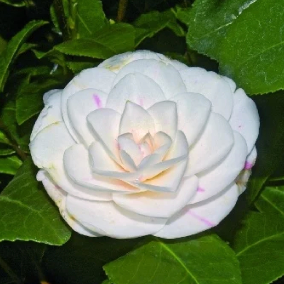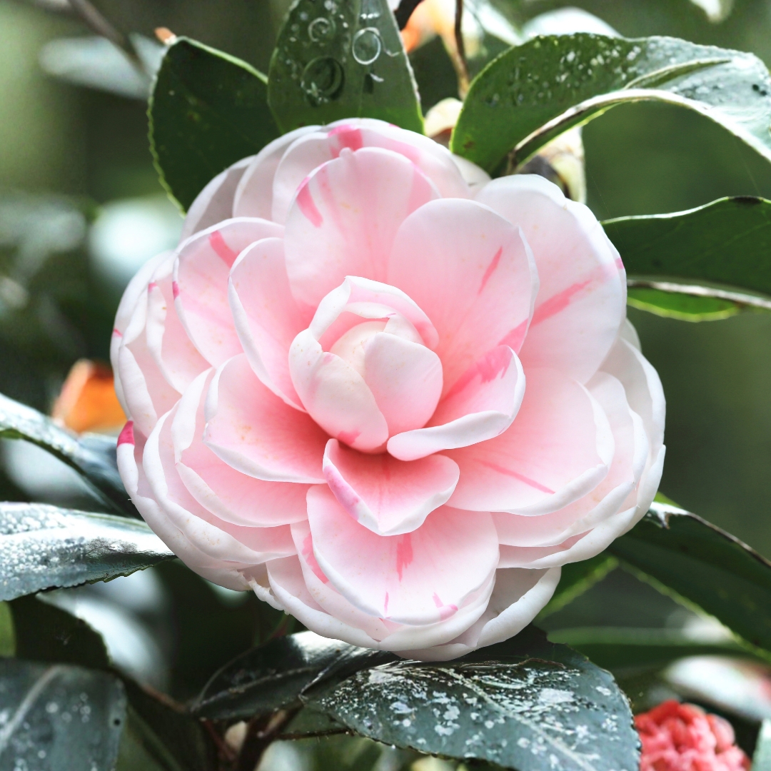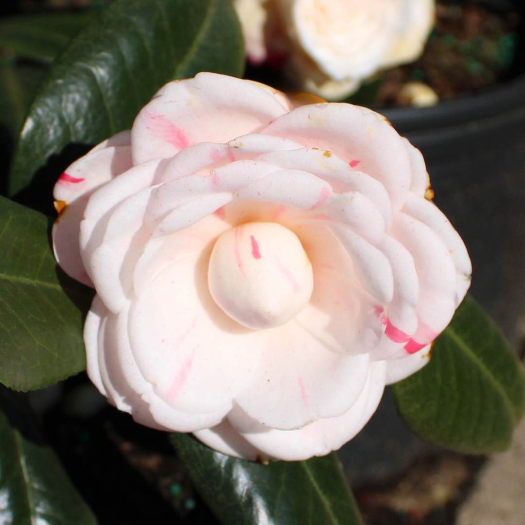 Camellia japonica ‘April Dawn’Camellia April Dawn is an exceptional evergreen shrub admired for its breathtaking, semi-double to double blooms that feature delicate lines of pink amongst white petals. Each flower appears as if hand-painted, with unique variations that make every bloom a small masterpiece. These striking blossoms emerge in late winter through early spring, bringing a welcome burst of color when much of the garden is still waking from dormancy. Its glossy, deep green foliage provides a lush, elegant contrast to the pastel-toned petals, ensuring year-round interest and beauty in the landscape.