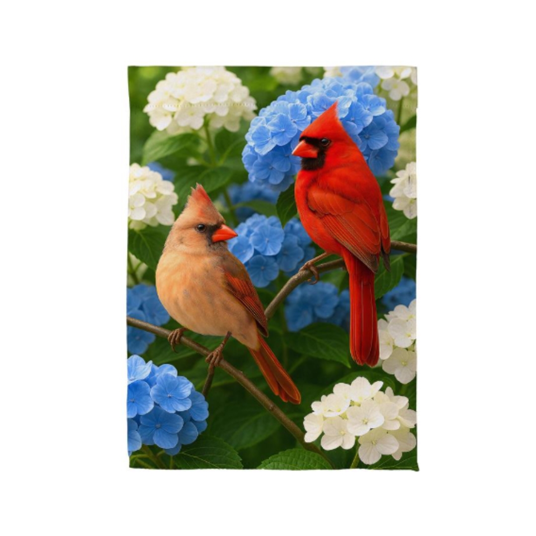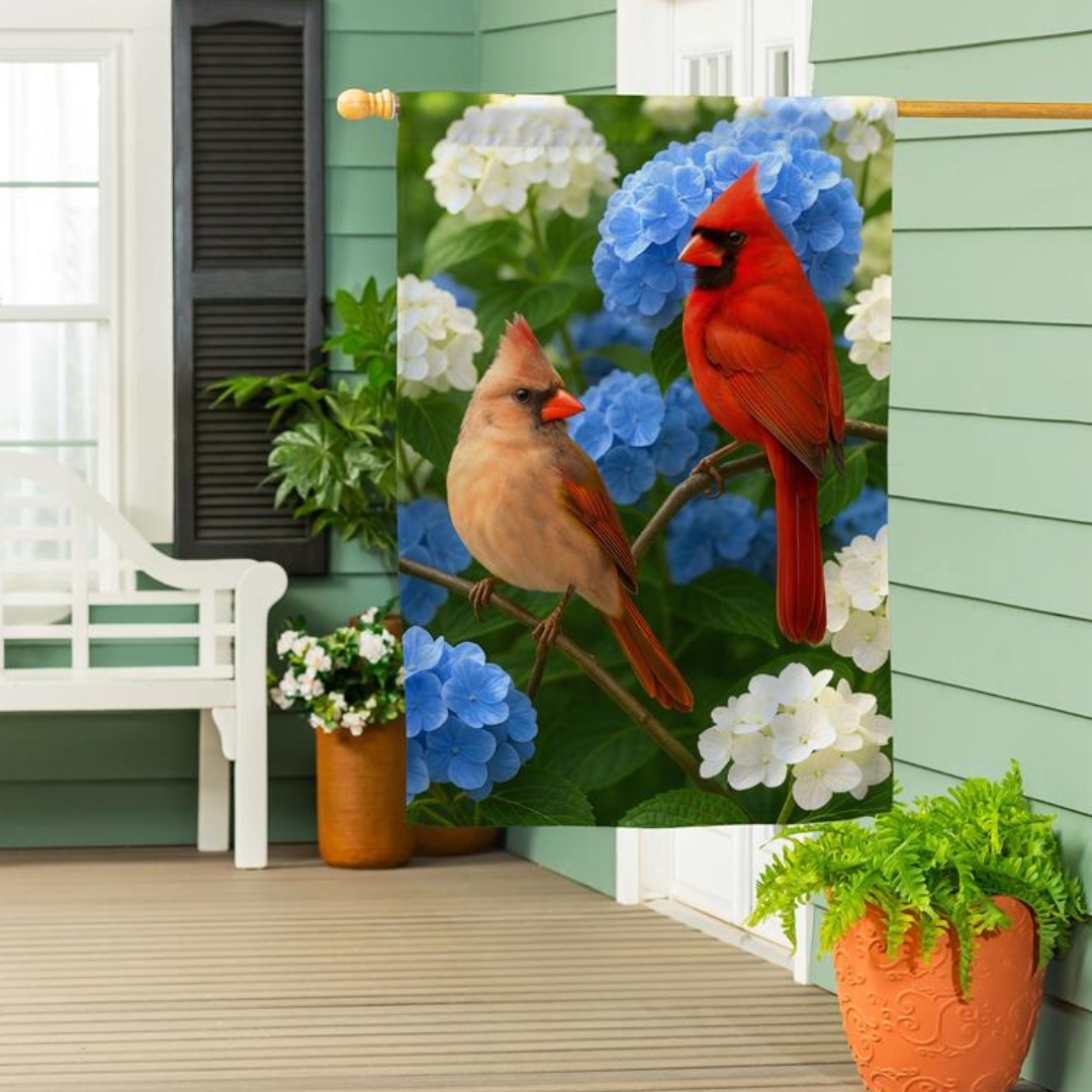 Celebrate vibrant garden beauty with the Cardinal Couple Among Hydrangeas Garden Flag, featuring a charming depiction of a pair of cardinals nestled among blooming hydrangea blossoms. This cheerful outdoor accent brings a touch of nature-inspired elegance to patios, porches, yard beds, and entryways, adding seasonal color and inviting charm to any outdoor setting. Designed with detailed artwork that highlights both the bird life and floral accents, the flag enhances your landscape décor with visual depth and warmth.