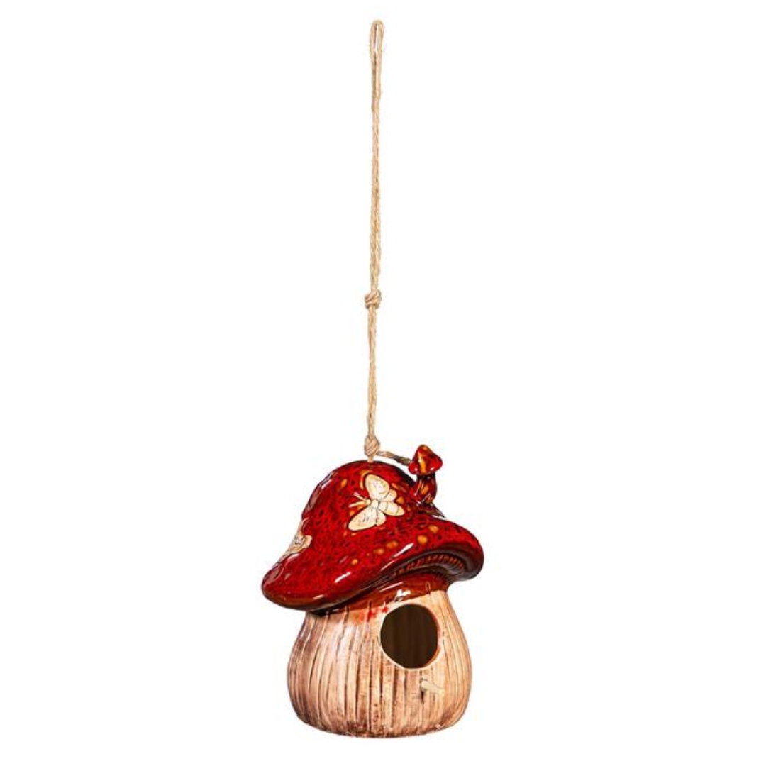 Crafted from weather-resistant ceramic, this decorative birdhouse stands up well to outdoor conditions while retaining its bright colors and smooth finish. The mushroom cap design and textured details create a visually engaging accent that blends beautifully with flowers, foliage, and other garden décor. Hang it by the included cord or rope to create an eye-catching display high above borders or seating areas.