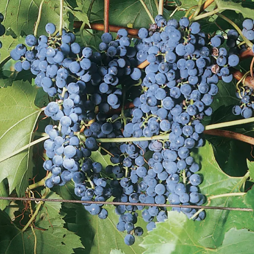 In late spring, Frontenac produces small greenish-white flowers that are valuable to bees and other pollinators yet are not particularly showy. These blooms give way to clusters of round, blue-black grapes by late summer to early fall (typically September). The fruit is known for its deep color, robust flavor, and high acidity, making it ideal for red wine production, rosé blends, juice, and culinary uses. Its bold flavor profile has made Frontenac a favorite among home winemakers and vineyard enthusiasts across northern regions.