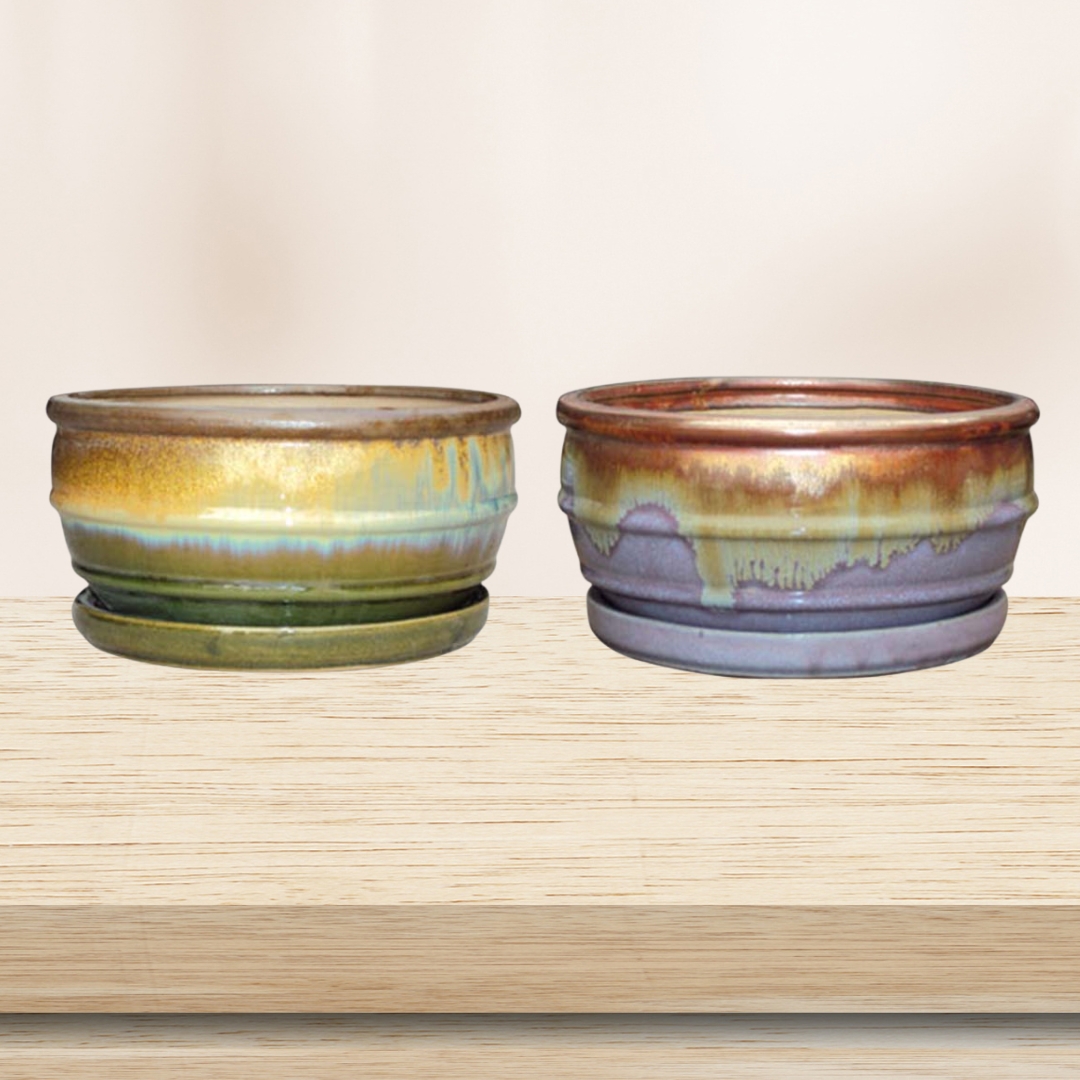 Crafted from durable glazed ceramic, each set includes two coordinating dish planters in graduated sizes, allowing for creative layering or use throughout the home. The wide, shallow profile is ideal for dish gardens, succulents, herbs, bonsai, and mixed plant arrangements, offering ample room for root spread while maintaining a low, balanced presentation.