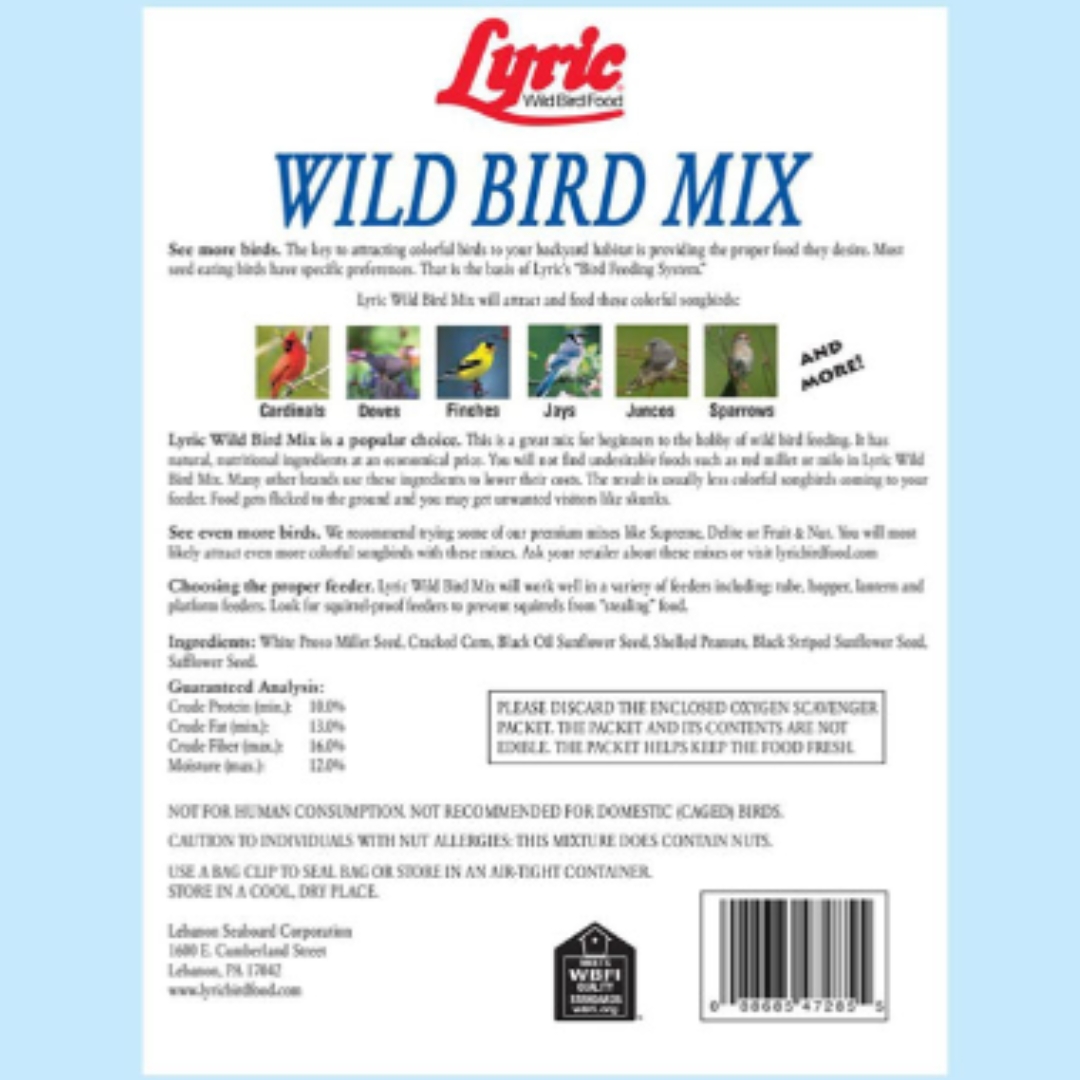 Lyric Wild Bird Mix is a premium all‑natural bird seed blend thoughtfully crafted to attract a wide variety of backyard birds year-round. Each bag contains a balanced combination of cracked corn, white proso millet, black oil sunflower seeds, black striped sunflower seeds, shelled peanuts, and safflower seed, providing high-energy nutrition that supports birds’ daily activity, from foraging and nesting to migration prep. By delivering quality seeds without fillers, this mix ensures that birds spend more time eating the nutritious portions rather than picking through debris.