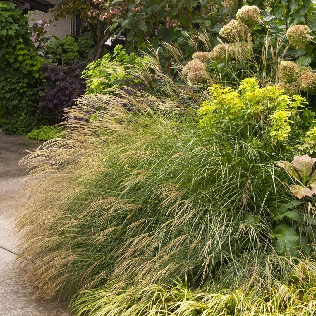 In late summer, ‘Gracillimus’ produces coppery flower heads that mature into silvery-white plumes, creating a striking seasonal display. Its foliage turns golden-bronze in autumn, adding warmth and visual interest to outdoor spaces. This versatile grass thrives in a variety of climates and is ideal for borders, mass plantings, or as a focal point in garden designs. Its drought tolerance and low-maintenance nature make it a favorite among gardeners.