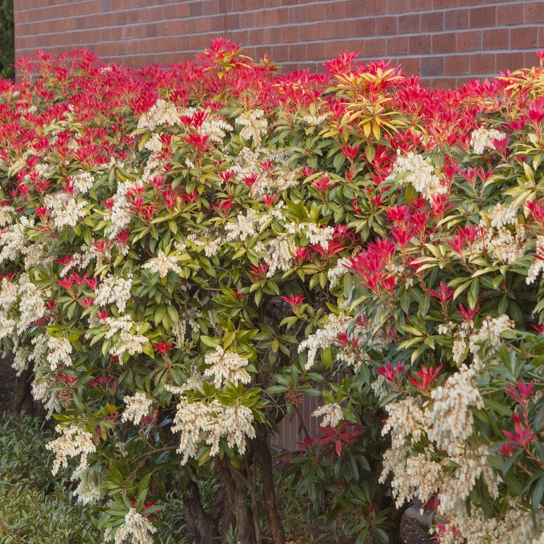 In early spring, Mountain Fire™ produces generous clusters of elegant, lily-of-the-valley-like white flowers that cascade gracefully from arching stems. These nodding blooms provide a dramatic contrast against the evergreen foliage and announce the arrival of spring with soft, classic charm. The combination of vibrant foliage color and frilly flower clusters makes this Pieris selection a standout choice for gardeners seeking impact and year-round structure.