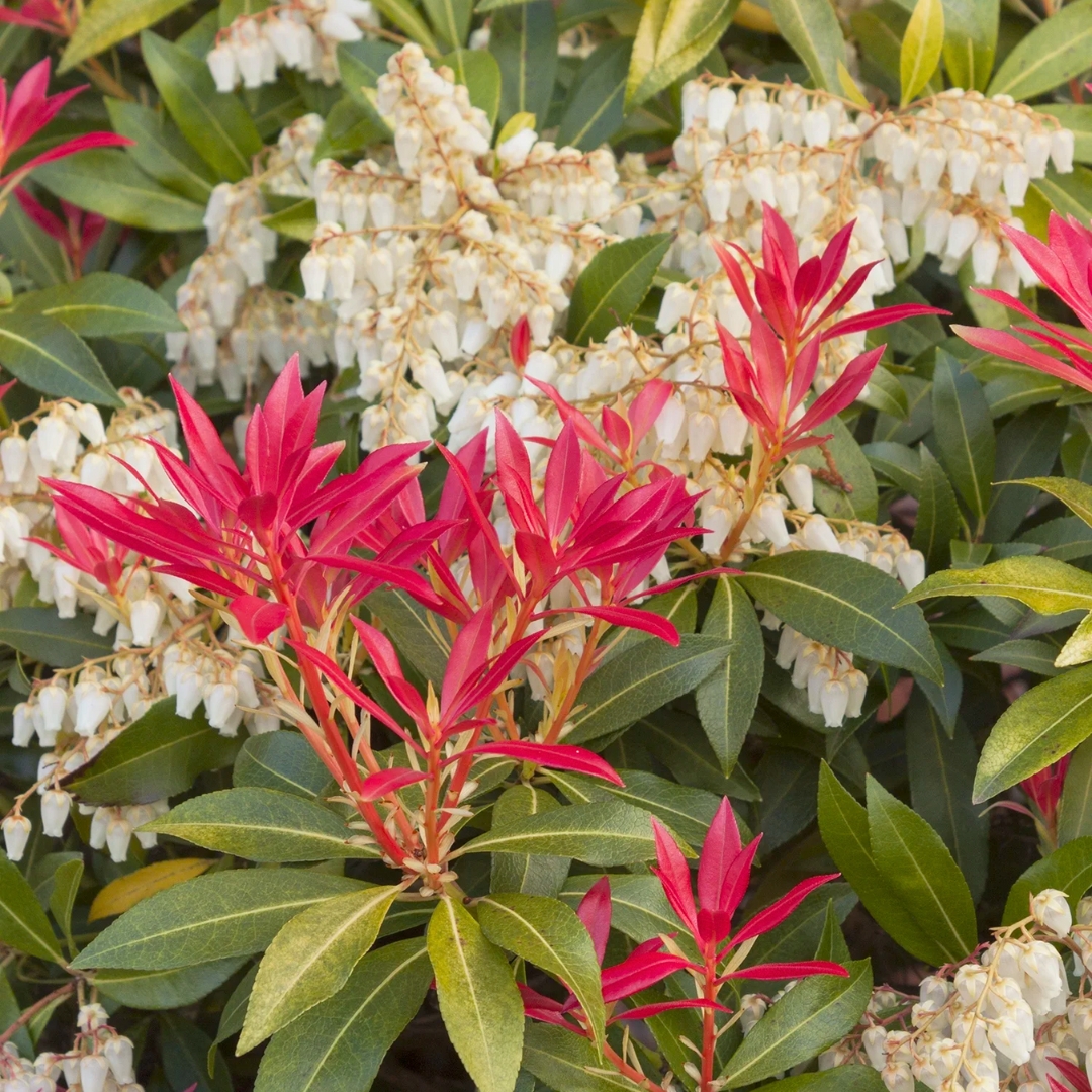 Mountain Fire Andromeda, Pieris japonica ‘Mountain Fire’, Mountain Fire™ Lily of the Valley PierisMountain Fire Pieris is a striking evergreen shrub that brings spectacular seasonal color and refined texture to landscapes. This exceptional cultivar is celebrated for its fiery new growth that emerges in brilliant red, making a vivid early-season statement before the leaves mature to a rich, glossy dark green.