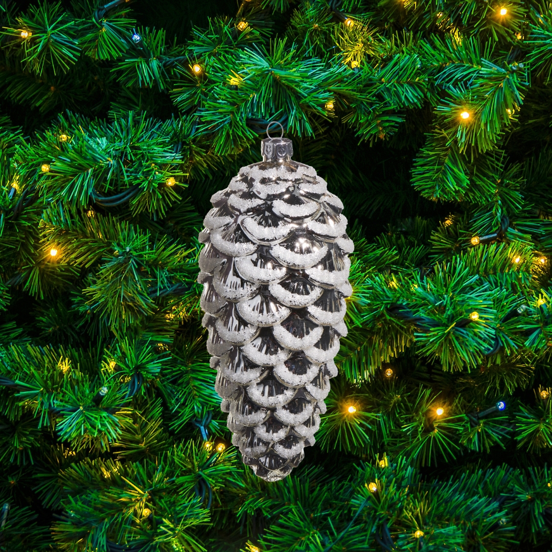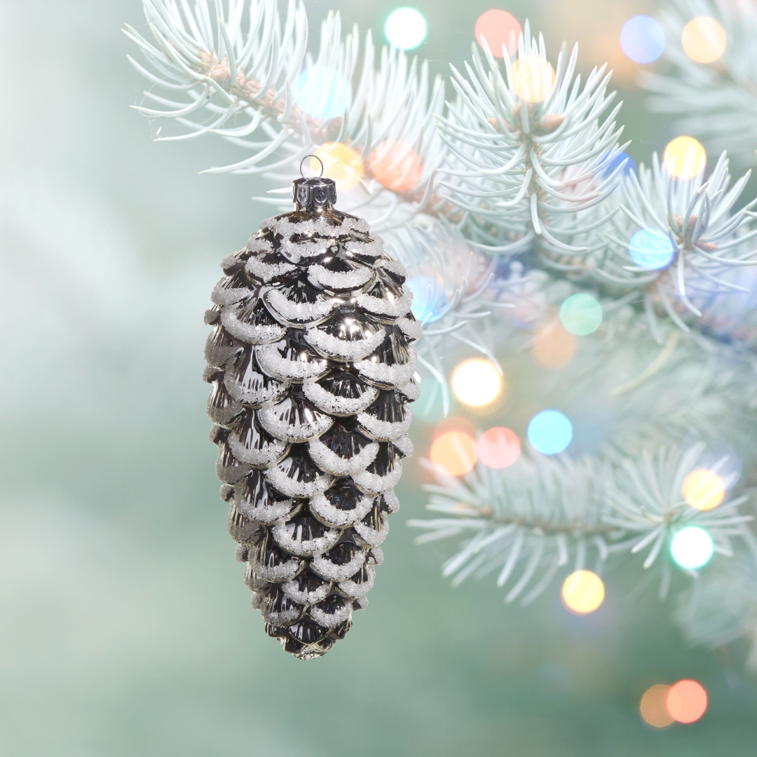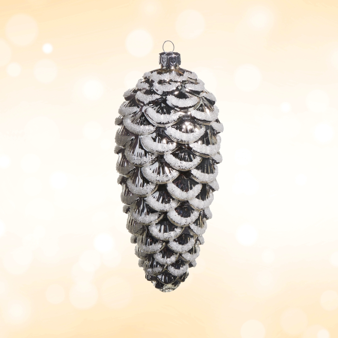 Bring shimmering woodland charm to your holiday décor with the 7″ Silver Iced Pinecone Ornament. This elegant piece is crafted from glass, featuring lifelike pinecone texture coated in a frosty silver finish that catches and reflects light beautifully. Its delicate, ice-like appearance evokes a winter wonderland, making it a standout addition to any Christmas tree.