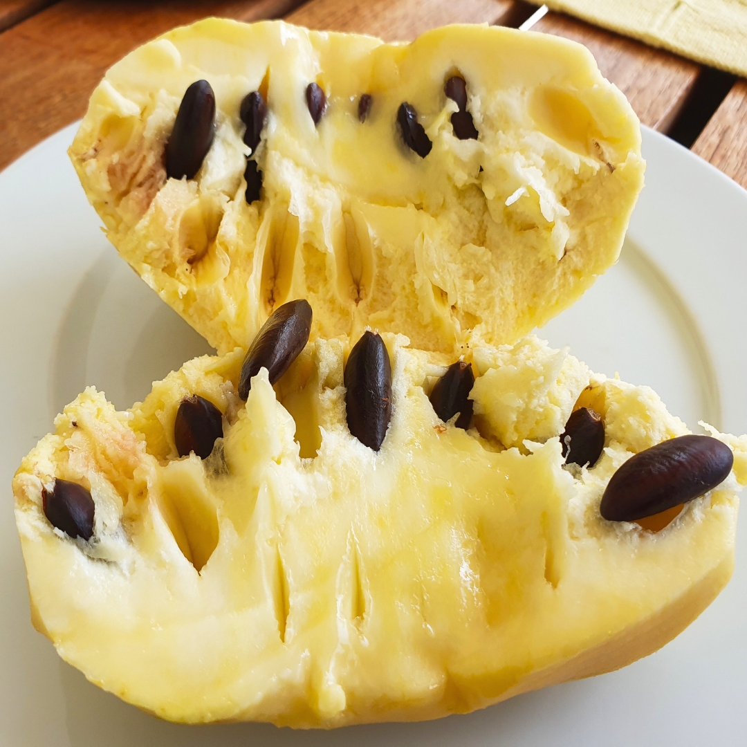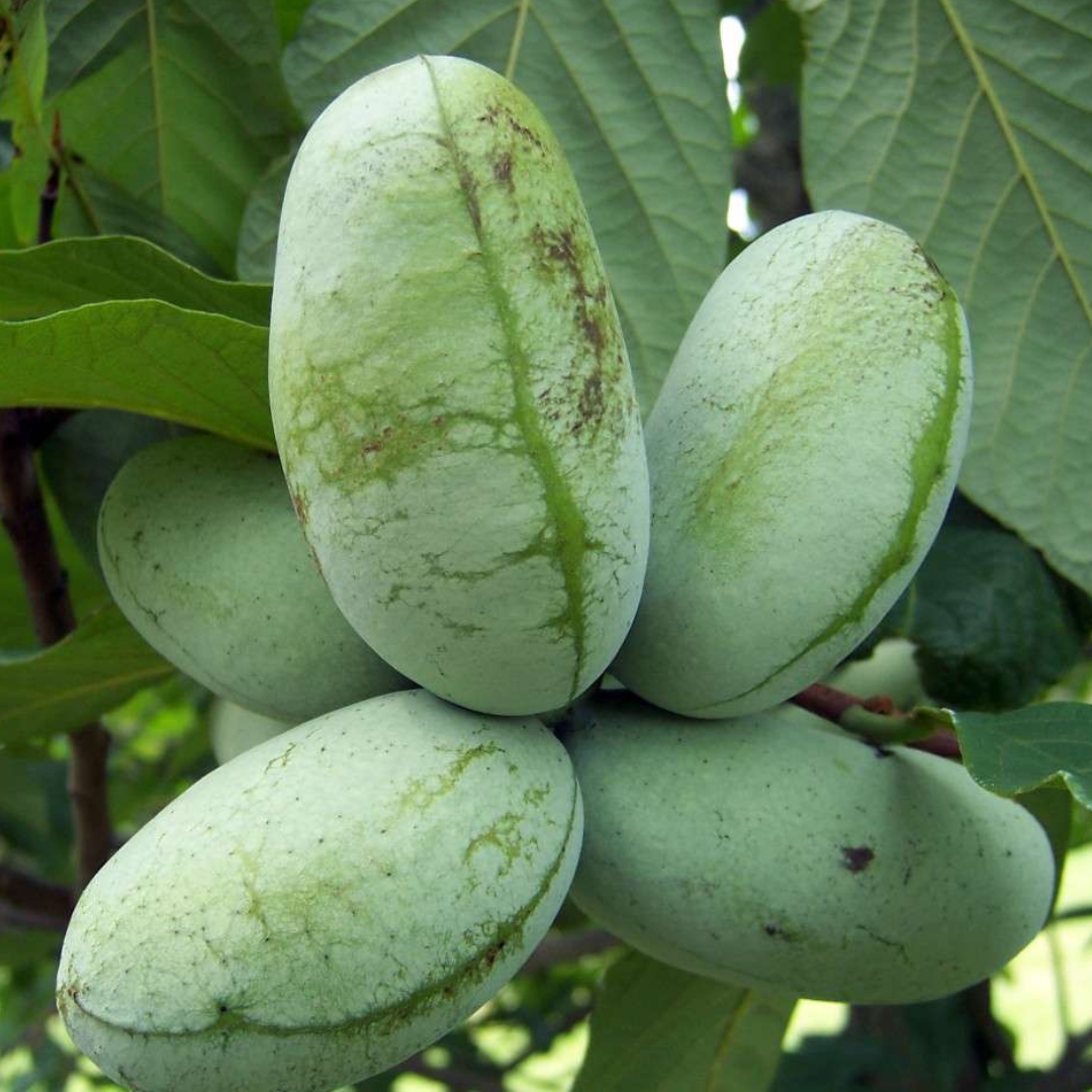 The fruit of the pawpaw ripens in late summer to early fall and is oblong, green to yellowish when mature, with soft, custard-like flesh inside. The flavor is rich and complex, often described as a blend of banana, mango, and melon. Pawpaw fruit is best eaten fresh or used in desserts, smoothies, breads, and frozen treats, as it does not store or ship well. This makes it especially prized for home growers rather than commercial production.