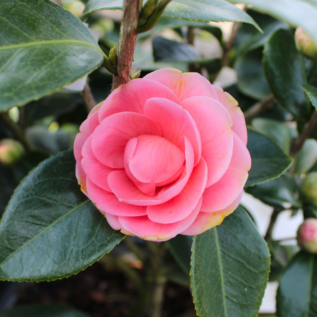 Throughout the year, this camellia maintains dense, evergreen foliage that adds texture, depth, and structure to the garden. Mature plants typically reach 6–10 feet tall and 6–8 feet wide, forming an upright to rounded shrub suitable for hedging, specimen use, or as a backdrop in mixed borders. Its evergreen presence ensures continuous visual appeal, even outside of bloom season. Pink Perfection Camellia is particularly valued for its dependable performance in cooler climates where traditional camellias may struggle.