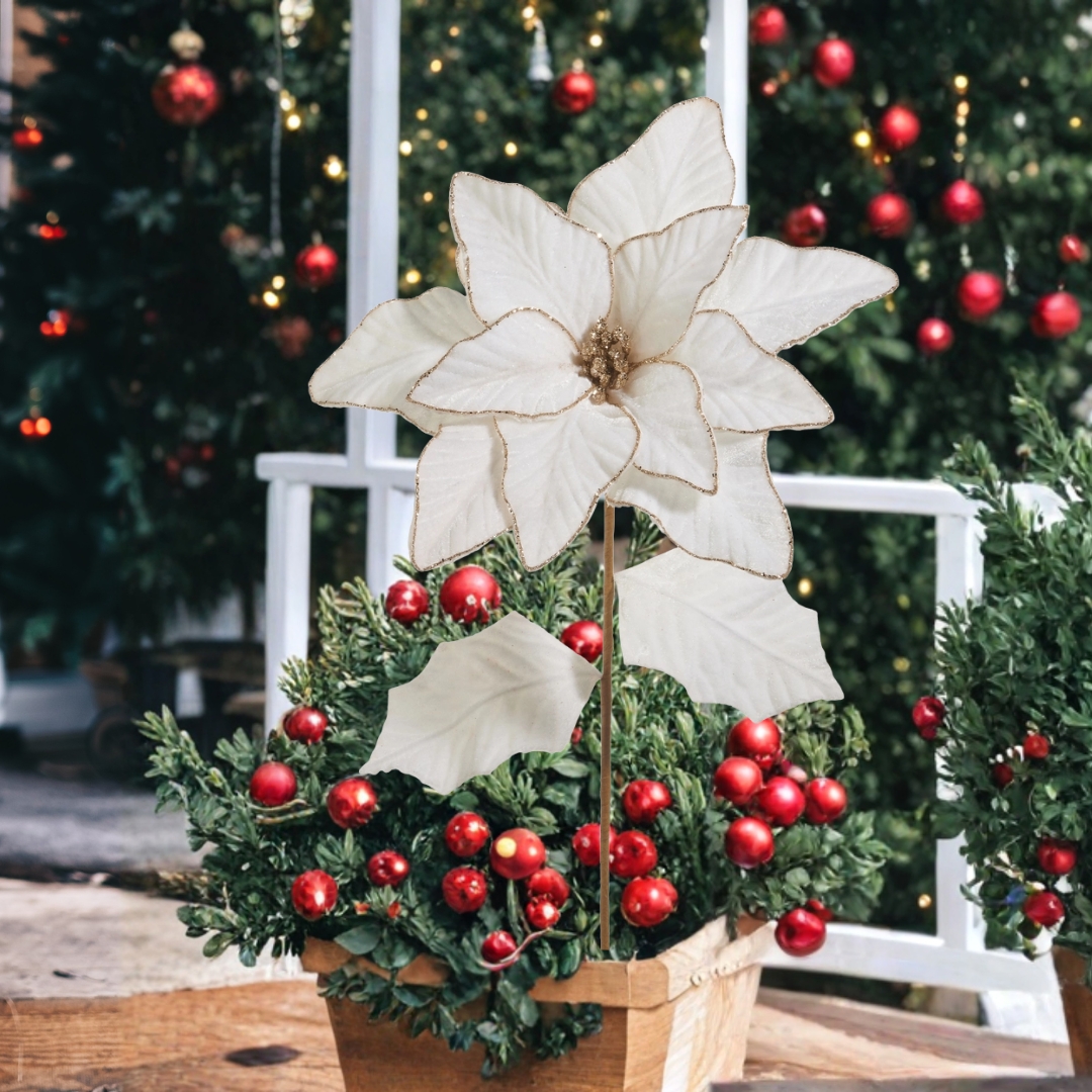 The 27″ Ivory Poinsettia Stem brings an elegant, winter-white touch to any holiday arrangement. Its extra-large layered petals feature a soft ivory hue with subtle shimmer accents, creating a luxurious look that stands out beautifully in trees, container gardens, and centerpieces. The realistic veining and gently shaped petals add depth and dimension, making it a statement piece in both traditional and modern holiday décor.