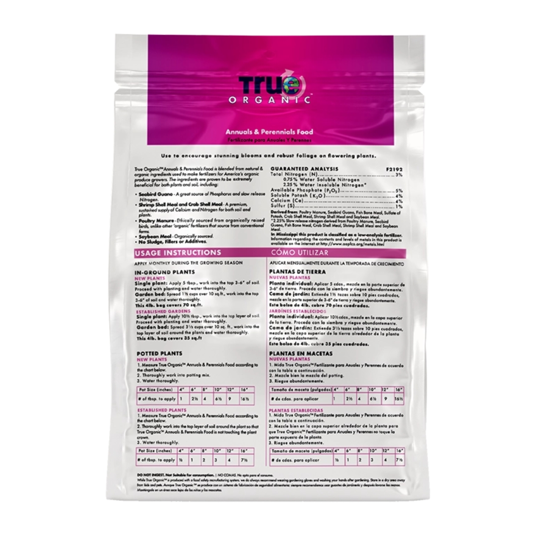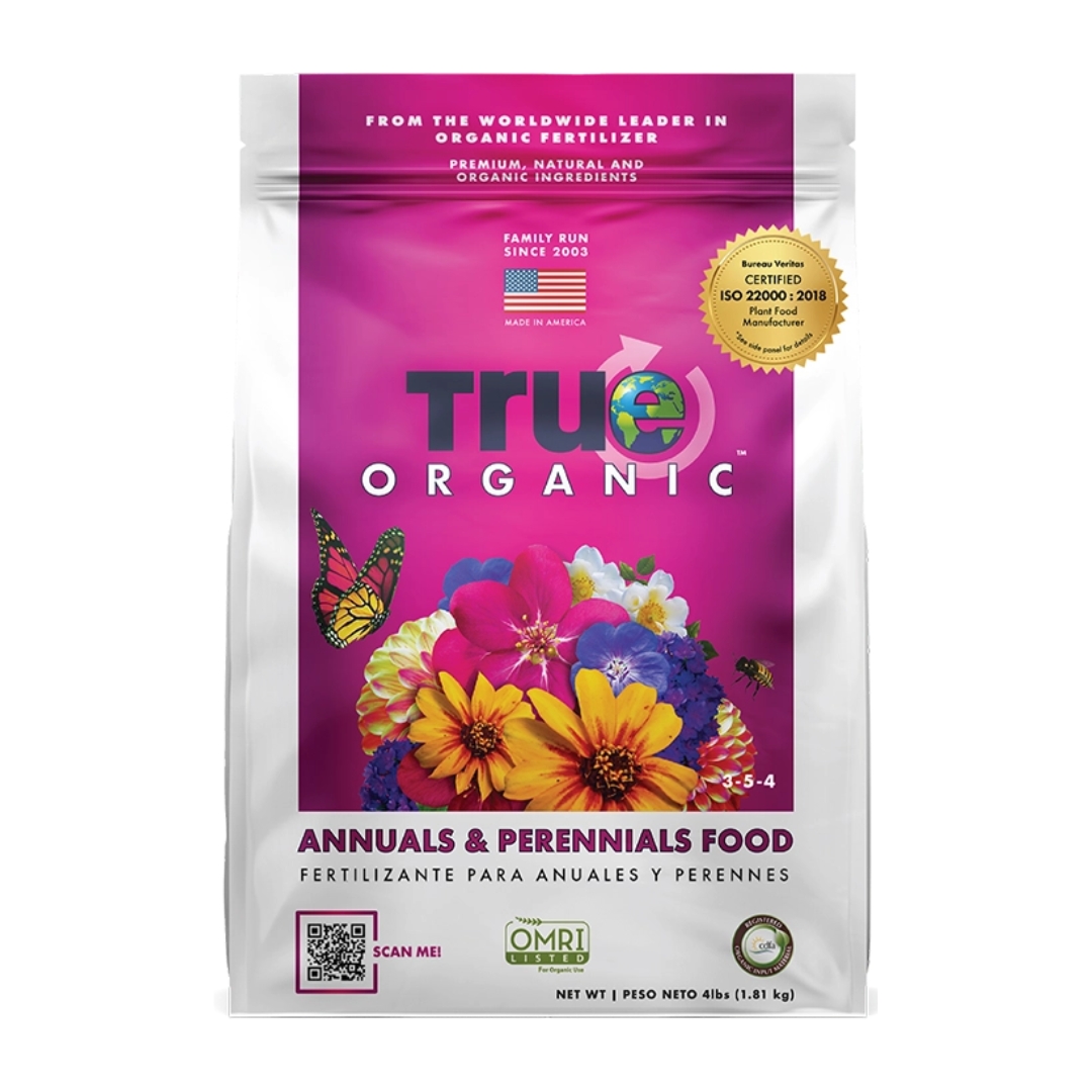 True Organic™ Annuals And Perennials Food is a 100% organic granular fertilizer formulated to help flowering plants and garden beds thrive with vibrant blossoms and strong foliage. It delivers a balanced nutrient profile (N-P-K 3-5-4) that supports healthy root development, abundant blooms, and lush growth throughout the spring and fall growing seasons. This blend includes 4% calcium to help build sturdy cell structure and improve overall plant health.