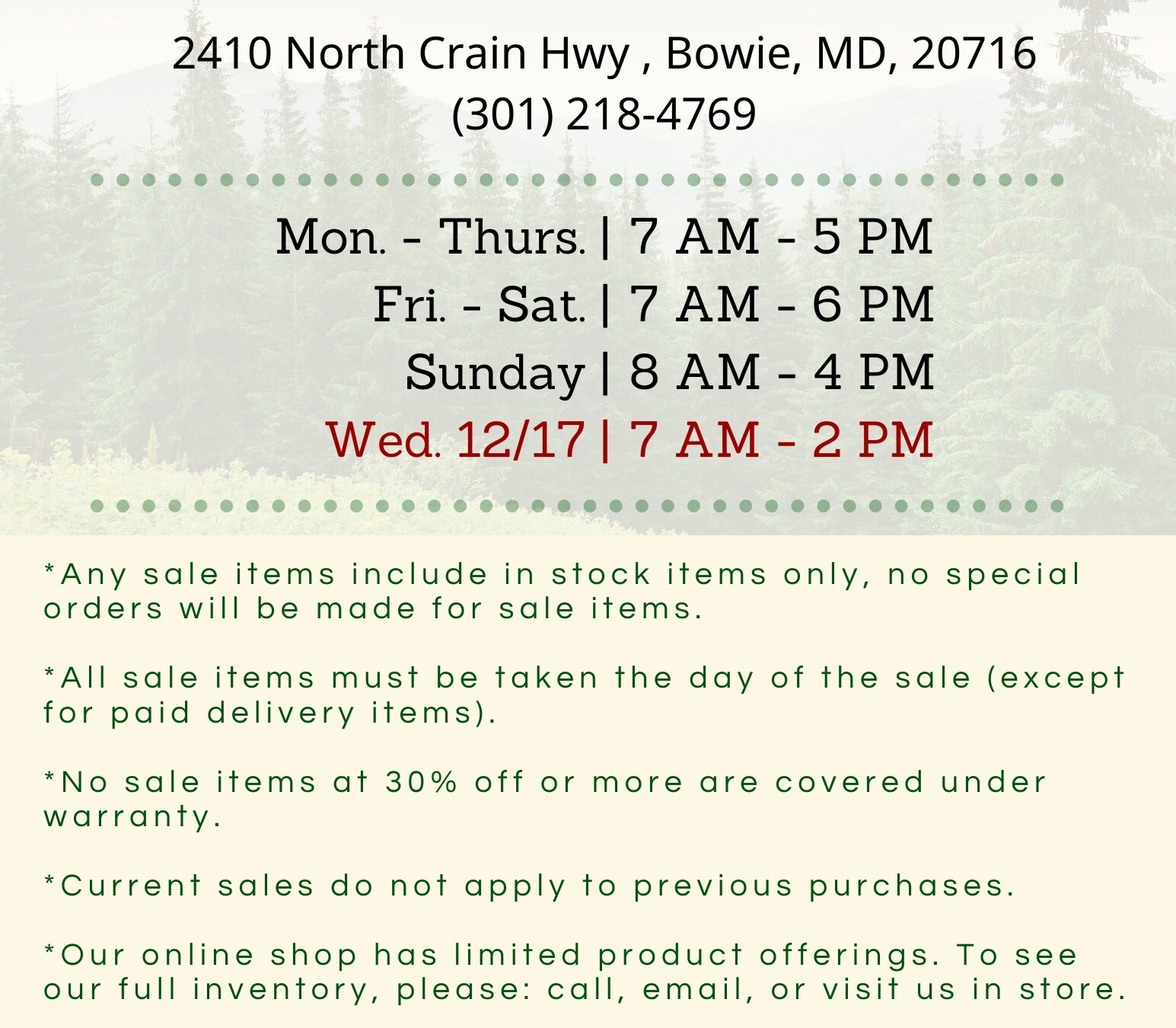 Christmas Day (12/25) & New Year’s Day (1/1): CLOSED
