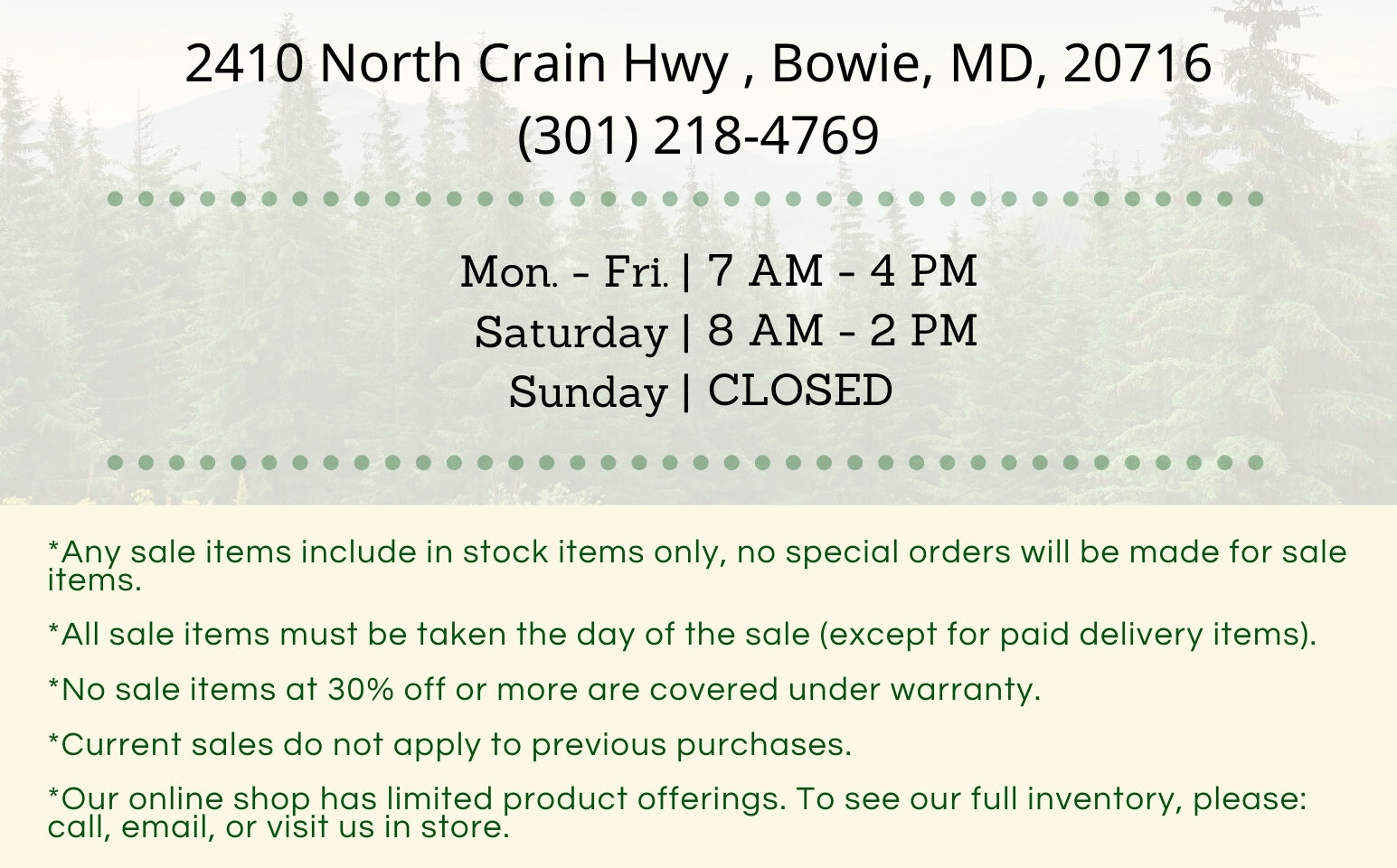 Store Hours: Monday – Friday: 7 am – 4 pm Saturday: 8 am – 2 pm Sunday: CLOSED